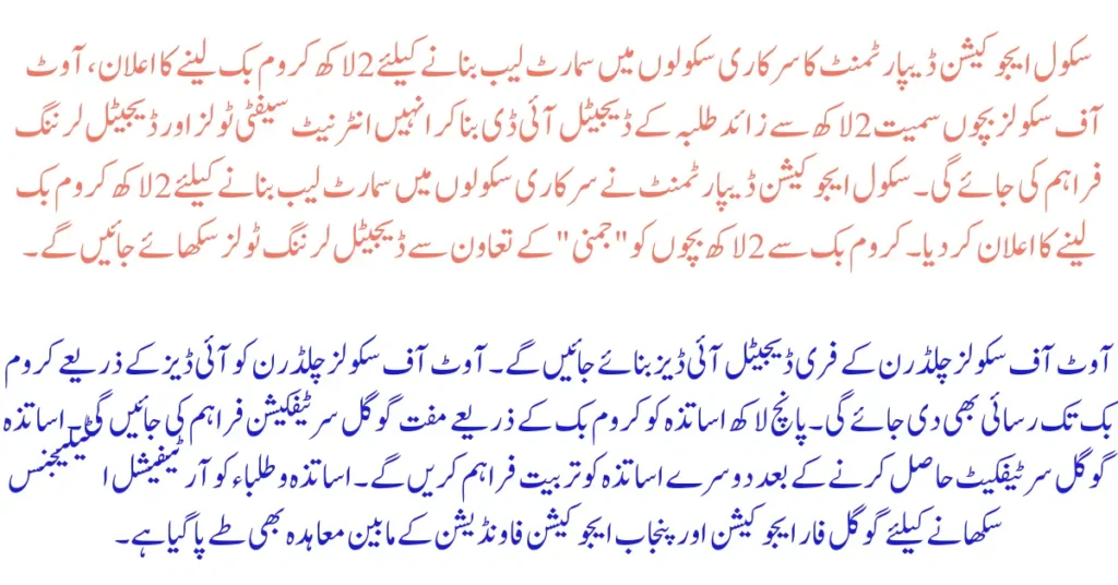 The decision of the School Education Department to purchase 200,000 Chromebooks to set up smart labs in government schools is an important step that will not only improve the education of students in government schools but will also provide educational opportunities to out-of-school children. This project will provide modern facilities such as Google certification, digital IDs, and artificial intelligence education, which will help bring Pakistan’s education system in line with world standards.