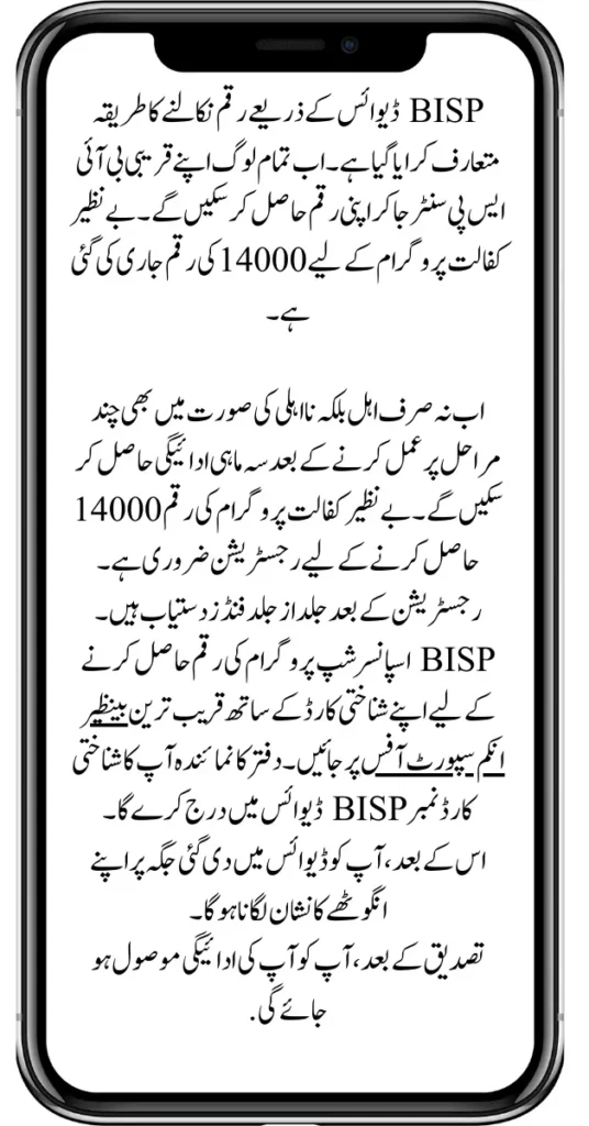 The method of Withdraw Money Through A BISP Device has been introduced. Now all the people will be able to go to their nearest BISP center and get their money. An amount of 14000 has been released for the Benazir Kafalat program.